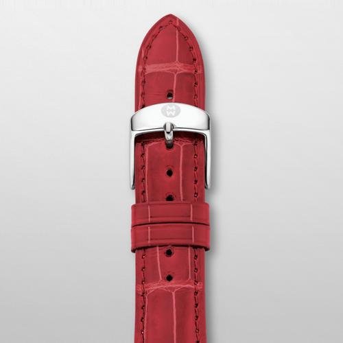 Complimentary Shipping. Update your look with a rich, garnet alligator strap. The strap is easily interchangeable with any 20mm Michele watch, and the stainless steel buckle has the signature logo engraving. The standard buckle comes in Stainless Steel. Please call 800-522-8463 if you would like the buckle in Gold or Rose Gold. Strap Size: 20mmMaterial: AlligatorOrigin: USA and Imported