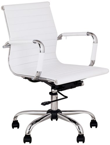 This office chair combines smooth, modern lines with sleek white faux leather upholstery. The frame is brilliant chrome plated steel. This ultra-functional chair offers a rolling, swivel base and a tilt mechanism. Great for home or office.