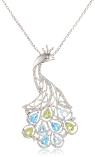 XPY Sterling Silver Licensed Swiss Blue and Light Blue Topaz, Peridot and Diamond Peacock Pendant Necklace (0.13 cttw, I-J Color, I3 Clarity), 18" Product Description:
