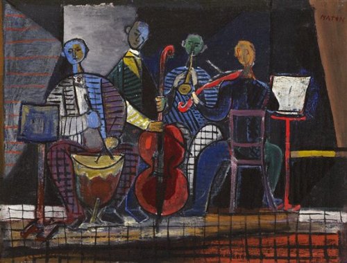 The Orchestra by Avraham Naton (Natanson). Naton was born in 1906, Bucharest and immigrated to Israel in 1935. He studied in the Art Academy, Bucharest. Prizes: Dizengoff Prize; Milo Prize. 1948 He was a founder of New Horizons Group. Participated in Biennale in Venice, Sao Paulo, Johannesburg. He died in 1959. Gorgeous Handpainted art - oil on canvas. Buy it now at an exceptional price for exceptional design and quality guaranteed.