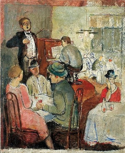 Concert at Cafe by Avraham Naton (Natanson). Naton was born in 1906, Bucharest and immigrated to Israel in 1935. It is a magnificent Handpainted art - oil on canvas. Buy it now at an exceptional price for exceptional design and quality guaranteed. PishPoshPaints - making art affordable!