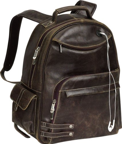 This classic backpack has timeless appeal. Done in distressed leather, this rugged pack's endless features include a spacious compartment with padded laptop sleeve and mesh pocket inside, a zip compartment in front loaded with pockets for a PDA, phone, cards, pens, a zip pocket at the top front with a pocket inside for an iPod, a flap pocket, and a hidden mesh pocket on the side for accessories and a water bottle. Sleek leather straps and two-sided stripes add to its allure.