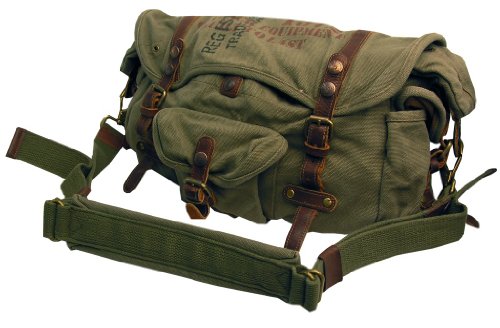 This exceptionally durable rough and tough shoulder bag is built to last a lifetime using heavy duty washed cotton canvas. This quality bag features real leather straps and clasps with lock down heavy duty metal buckles that ensures your bag stays shut and secure no matter what wear and tear you may subject it to. The spacious fully cotton lined inner compartment will carry the bulk of your load, and for extra storage there are spacious pockets on the sides and front. Other features include a reinforced shoulder strap for additional carrying convenience. 2 front pockets with snaps. Front flap buckles down. 2 side pockets (one on each side). Top zipper closure. Inside zippered pocket. Rear snap pocket.